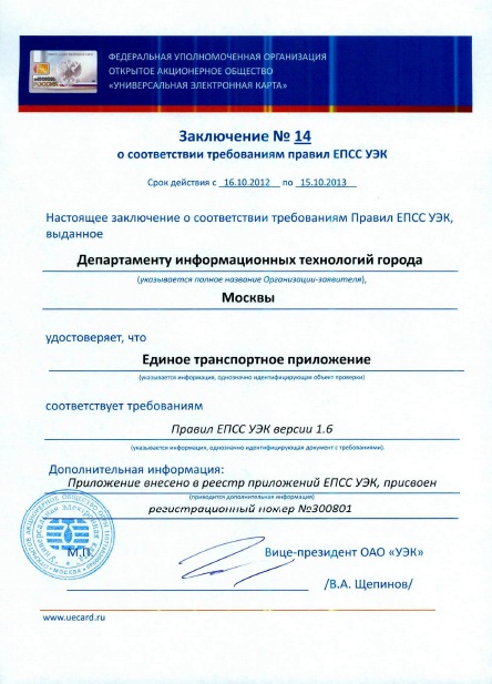 16 октября 2012 г. единое транспортное приложение УЭК г. Москвы, разработанное компанией "Удобный маршрут" по заказу Департамента информационных технологий г. Москвы, прошло сертификацию в Федеральной уполномоченной организации ОАО "УЭК".